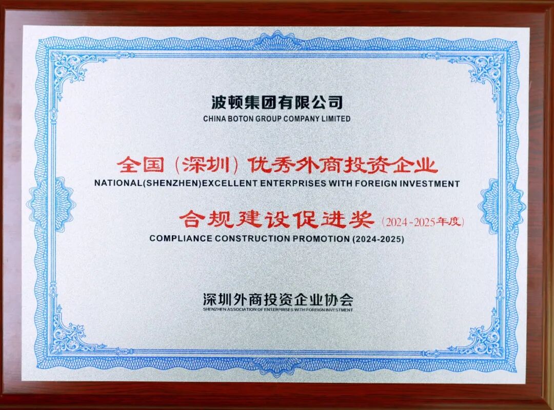 2025年12月16日,2025年全國(深圳)優秀外商投資企業表彰大會暨深圳市外商投資企業優秀管理者表彰大會在深圳前海國際會議中心舉行。波頓集團榮獲2025年全國(深圳)優秀外商投資企業“雙優企業獎”、“和諧勞動關系促進獎”、“合規建設促進獎”和“綠色減碳促進獎”等稱號。